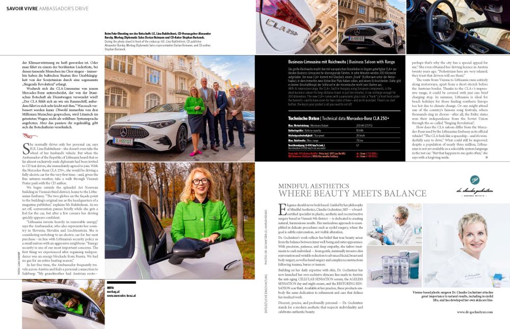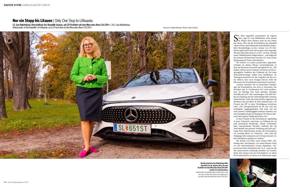 I.E. Lina Rukštelienė, Botschafterin der Republik Litauen, auf CD-Testfahrt mit dem Mercedes-Benz CLA 250+ / Ambassador of the Republic of Lithuania, on a CD test drive in the Mercedes-Benz CLA 250+